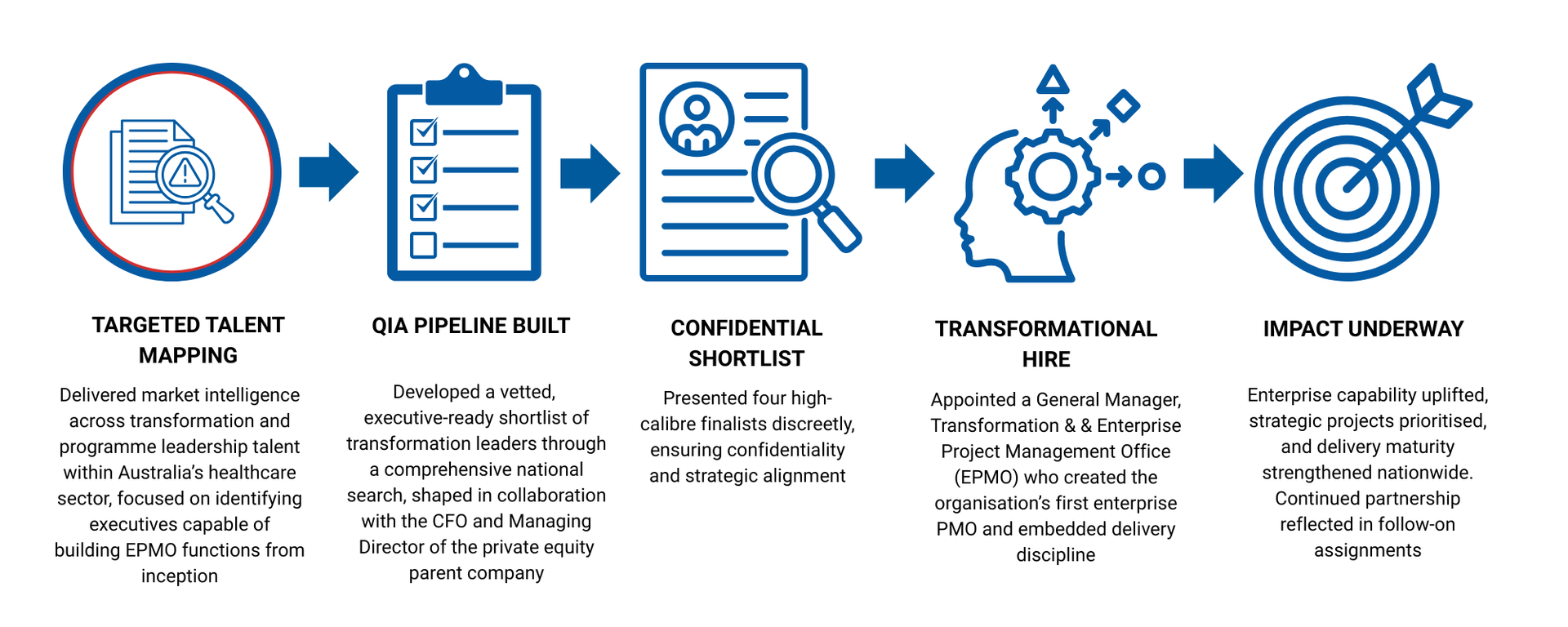 Momentum Search & Selection was engaged to conduct a critical executive search for a healthcare organisation newly acquired by a private equity firm. Despite operating multiple healthcare facilities across Australia, the business lacked an enterprise-wide project management office to coordinate strategic initiatives and uplift delivery capability.